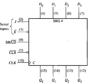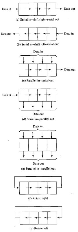Above: Fig. 12: Four positive edge-triggered JK flip-flops connected together to provide a shift register. The clocks of each flip-flop are connected together and the Q output of each flip-flop is connected to the J in put of the next. The value (1 or 0) that is stored in each flip-flop is shifted from its output to the in put of the next flip-flop each time the clock is pulsed. A number of different types of shift registers are available to provide bit shift functions for a variety of applications. Fig 13 shows some of the different types of bit shift registers.