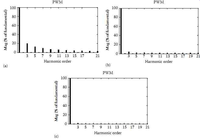 7.2 Principle of the Unipolar PWM Control The generation of the U-PWM control pattern is illustrated in FIG. 48. It is based on two comparisons: (1) between a control signal β and a triangular high-frequency carrier, and (2) between the opposite of the control signal (−β) and the same carrier. A typical waveform of the control signal β is given in FIG. 49. Such a signal, which is slow time-varying in each half-period-wide interval, is generally delivered by a closed-loop PI controller that adjusts continuously the current ic at the input of the active filter to track a current reference ic* such that ... ...where ωs denotes the angular frequency of the mains. The waveform given in FIG. 49 allows compensating both the undesirable harmonics in the source current and the reactive power required by the nonlinear load. Considering the frequency range of the control signal β and the triangular carrier, one may consider that the modulating signal is practically constant during a switching period Tsw. In this case, referring to FIG. 48, we have ... …where… d1 and d2 are, respectively, the duty cycles of switches T1 and T3 over one sampling period Tsw ... m is the peak value of the triangular carrier. One can, thus, deduce the average value of the voltage vc at the input of the inverter over a switching period Tsw: It should be noted that the average voltage vc Tsw ... is proportional to the control variable β. For operation below the switching frequency, one can assume that the PWM inverter transfer function is equivalent to the constant G. 7.2.1 Harmonic Analysis of Active Power Filter Inverter Input Voltage vc According to FIG. 48, the voltage vc is an alternating modulated square wave signal. Its frequency is twice the control signal of S1 and S3, and its magnitude is lower than the peak of its fundamental. In the following, let us define vc = vc1 when the standard PWM is used and vc = vc2 when the U-PWM is used. 7.2.2 Harmonic Analysis with Standard PWM (vc = vc1) Under the assumption that the voltage vc1 remains periodic over a few successive switching cycles, i.e., d1Tsw = constant, by applying the Fourier transform to vc waveform shown in FIG. 50, a first local decomposition is applied to the voltage vc1: