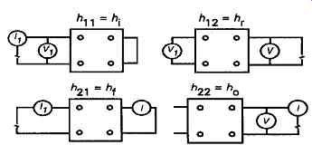 A more fundamental approach was therefore adopted in which these devices were treated simply as four terminal 'black boxes', as shown in FIG. 10, in which the relationships between the input and out put circuits could be specified in terms of their mutual impedance (Z) or admittance (Y) parameters. With growing familiarity in the use of these by circuit engineers it was found that some of these parameters were more useful than others, and so a combination of these, known as 'hybrid' or h parameters, has become almost universally adopted. In these, h1 is the input impedance, and is defined as ... hi is the forward current transfer ratio, and is defined as ...both of these measured with the output voltage held constant, ho is the output admittance, and is defined as ... ... and hT is the voltage feedback ratio, defined as ... .... both of these as measured with the input circuit open circuit (o/c) to AC. The numerical value of these parameters will vary, depending on whether the transistor is connected in the 'common emitter' (emitter returned to a neutral no signal line), 'common collector', or 'common base' configurations, and the condition for which the parameter is defined will be denoted by the subscript. For example, if the 'forward current transfer ratio' -- commonly known as the 'current gain' -- were to be specified for a transistor connected, as it would normally be, in the common emitter mode, the symbol Af e would be employed. Another convention is that an upper case (capital) subscript is used to denote the large signal, or DC value, of this characteristic. If the small signal value is intended, as, again, would normally be the case, the subscript to the h symbol is written in the lower case, so a numerical value quoted for Af e means the 'small signal current gain, for a transistor connected in the common emitter configuration'. From the published values for these parameters, the circuit performance may be calculated. For example, the stage gain given by a junction transistor in the circuit of FIG. 11 can be derived from the equation: ... where Rs is the source resistance, R1 is the load, and r_i is the internal (base/emitter) impedance of the transistor.