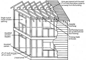 The following advanced framing techniques can be applied to many renovation projects: • Increase wall stud spacing to 24 inches on center (o.c.), rather than the standard i6 inches. This uses fewer framing members, therefore saving materials and labor costs. • Space floor joists and roof rafters at 19.2 or 24 inches instead of i6 inches to save floor joist material (more space means less material) and labor. • Use inline framing, in which floor, wall, and roof framing members are in line with one another and loads are transferred directly to the foundation (sometimes called “inline” or “stack” framing). This technique enables you to use the engineered strength of the material to transfer point loads, thereby eliminating the need for large headers in load-bearing walls. Check with local codes to make sure this is permitted on your project. • Design homes on two-foot modules, thereby reducing cutoff waste and installation labor, since most panel products come in even-incremented dimensions such as four by eight feet. • Use two-stud corner framing instead of three-stud, and replace two- and three-stud backing for drywall attachments at wall “T” intersections with inexpensive drywall clips or scrap lumber. Three-stud corners are the traditional standard due to relative ease of applying drywall, but by using two-stud corners with drywall-clips to hold the drywall, you use less wood while effectively supporting the drywall. This also gives additional room for insulation, raising the whole-wall R-value. • Carefully size headers used to support the load above an opening. Builders typically use two-by-tens simply because it is the industry standard, but smaller sizes are adequate and save material. • Eliminate headers in non-load-bearing walls. They are not needed, because a header’s sole job is to protect the opening from the load above. • Substitute 2” x 6” studs (24” o.c.) for conventional a 2” x 4” (16” o.c.) framing. By using 2” x 6” studs, you save time and labor costs (offsetting slightly higher per-item material cost), since they are 24 inches as opposed to i6 inches apart. The increased spacing allows for additional insulation in wall cavities, which improves thermal resistance and saves you money on energy bills. • Space roof rafters at 19.2 inches or 24 inches to save on roofing materials. • Use trusses instead of stick-framed roofs. With trusses, builders can use 2” x 4” lumber. This saves the larger dimensional wood from old-growth forests that is typically required for stick-framed roofing rafters. • Install energy heels of 6 inches or more on trusses to allow for increased ventilation and insulation. • Provide a sizable overhang to shade your home and prevent precipitation from damaging the siding of your home. Knowledge of these advanced framing techniques is key to saving money and resources on your project. Additionally, intelligent material choices detailed in the following section will further save precious wood. $ = cost effectiveness; EE = energy efficiency; RC = resource conservation; HB = health benefit Use Reclaimed Lumber - RC • As demands on forest resources have increased, non-forest sources of wood have grown in importance. High-quality reclaimed wood can be salvaged from places such as buildings slated for demolition or rivers, where sinker logs sank decades ago during river-based log drives. Reclaimed wood is often available in species, coloration, and quality not found in today’s forests. It is not tied to recent timber harvesting, it reuses materials, and it can reduce the construction and demolition load on landfills. • Recommendations: Use reclaimed lumber (in place of new material) for nonstructural applications. For structural applications, look for reclaimed lumber that is engineer-stamped and graded. The supplier may require you to pay for an engineers grading and stamping. In some cases, reclaimed wood suppliers have only limited quantities of woods with matching coloration or weatherization patterns. Ample lead time and accurate materials estimates can help ensure availability of the desired wood.