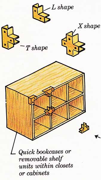 Connectors Manufactured in L, T, and X shapes, shelf connectors are designed to clip together 1-by boards. Each connector is predrilled with several small holes through which nails or screws are driven into shelf boards. Clips are available in either plastic or metal in a limited number of colors and finishes. They can, of course, be easily spray-painted any color. When buying connectors, remember to get enough to fasten both front and back faces of the unit. Using shelf connectors, you can build a freestanding shelf unit or one sized to fit into a cabinet. The look, though rather informal, is suitable for a laundry room or workshop. Or, the connectors can be emphasized by spray-painting them with bright- colored enamel, in one or more colors to make a high-tech statement. Because a cabinet built with clips can be disassembled without too much trouble, this system is particularly appropriate for informal furniture in a dormitory or apartment.