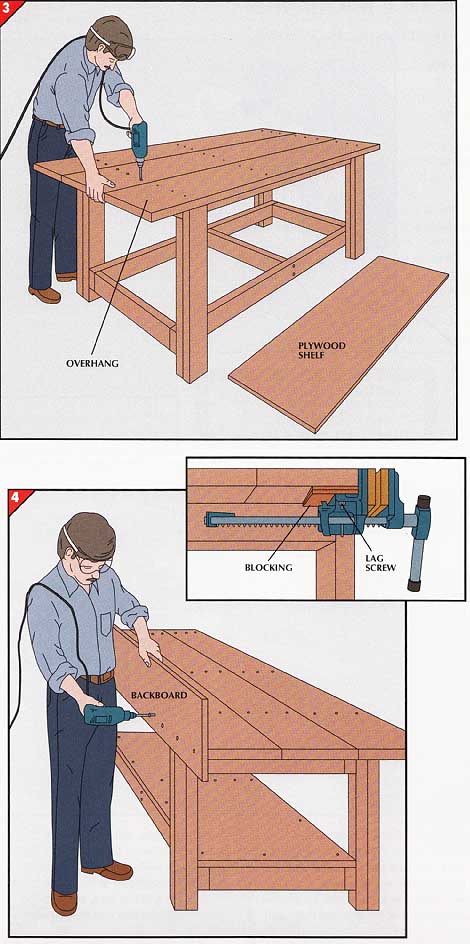 ASSEMBLING A BENCH WITH A BACKBOARD • Prepare each leg by cutting two 2-by-4s -- one 5 inches shorter than the planned height of the workbench and the other 1½-inches shorter. • Glue the sections together so the bottom ends are flush, creating a notch at the top. • Drill pilot holes into the shorter pieces, staggering the holes in a zigzag pattern about 4 inches apart. • Drive a 2½-inch No. 8 wood screw into each hole. • To support the benchtop, assemble a frame of two 2-by-4s cut 8 inches shorter than the planned length of the top, and three 2-by-4 crosspieces cut 3 inches shorter than its width (inset). Drill pilot holes at the ends and centers of the long boards, then fasten the pieces with glue and 3- inch screws. • Assemble a second frame for the bottom shelf in the same way as the top frame, but make each crosspiece 3 inches shorter than the crosspieces for the top. 2. Assembling the parts. • Lay two of the legs on the floor with their notched faces up, and rest the lower frame against them. • Position the lower frame 3 inches from the bottoms of the legs and flush with their outer edges. Spread glue on the contacting surfaces, then secure the legs to the frame with 2½-inch screws . • Turn the assembly over, propping up the free ends of the legs, and join the other side of the frame to the remaining legs in the same way as the first. • Fit the top frame into the notches at the top ends of the legs, making sure it is flush with the ends and outer edges of the legs. Fasten the top frame in place with glue and screws. • Cut three 2-by-los long enough to create a 7-inch overhang for a vise at one end of the top and a 1 -inch over hang at the other. Trim one of the boards so the back edge of the top will be flush with the outside of the legs. To save space, you can also make the front edge flush with the legs. • Place the 2-by-10s in position across the top frame. Drill countersunk pilot holes, then fasten the boards to the frame’s crosspieces with 2½-inch screws. • For the lower shelf, cut a piece of ½-inch plywood to fit over the bottom frame and secure it with glue and 1½-inch common nails. 4. Completing the bench. •With glue and 1½-inch screws, fasten a 2-by-4 to the back of the top frame between the back legs. •With glue and 1½-inch screws, attach a 1 -by-12 backboard to the back of the bench, positioning its bottom edge flush with the bottom of the filler 2-by-4. • Position a woodworking vise at the end of the bench with the 7-inch over hang, and mark the locations of the mounting holes. Drill holes at the marks and fasten the vise in place with lag screws appropriate for the size of the vise—typically – 3/8- by 2½-inch screws. If necessary, add blocking so the vise jaw is flush with or slightly below the top (inset). • With medium-grade sandpaper, smooth the top and backboard, and slightly round the sharp corners. CONSTRUCTING A WOODWORKING BENCH