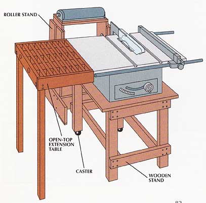 SAFETY TIPS: Wear goggles when nailing or operating a power tool. Shop-built accessories hold a table saw at a convenient height and extend its working surface; they can be adapted for use with other power tools as well. To support the saw, build a wooden stand 32 to 42 inches high, basing its design on the wheeled table, or on one of the workbenches. To enable a non-wheeled type to be moved easily, you can shorten two of its legs and add casters. An open-top extension table bolted to the saw table will steady a sheet of plywood or a long board during crosscutting. A freestanding roller stand—positioned on the out-feed side of the saw at a right angle to the direction in which you push the work—will support long boards during rip cutting. An Open-Top Extension Table