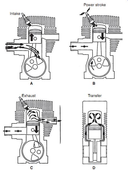 Scavenging Scavenging is the term for purging the cylinder of exhaust gases. Unlike a four cycle engine, which devotes a full stroke of the piston to clear the cylinder, a two-stroke must scavenge during the 100° or so of crankshaft rotation that the exhaust port remains open. Blowdown As the piston falls, it first uncovers the exhaust port and then, 5° or 10° of crankshaft rotation later, the transfer port. Blowdown occurs during this brief period that, at wide-open throttle, occupies no more than one or two thousandths of a second. In spite of its brevity, the blowdown phase is the primary mechanism for evacuating the cylinder. The rapid opening of a port releases a high-pressure slug of exhaust gas that trails a low-pressure zone or wave in its wake. Cylinder pressure momentarily drops below atmospheric pressure. Responding to the pressure differential, the fresh charge moves through the transfer port to fill the cylinder. At part throttle, crankcase pressure is less than cylinder pressure. Were it not for the drop in cylinder pressure that accompanies blowdown, two-cycle engines would not run. The need to accelerate exhaust gases quickly explains why exhaust ports for high-performance engines are rectangular rather than round. It also explains why we must keep these ports and mufflers free of carbon accumulations. Exhaust tuning When a high-pressure wave encounters a solid obstacle or an abrupt change in direction in the exhaust plumbing, it rebounds back to the exhaust port. These waves oscillate at the speed of sound and at a frequency determined by engine rpm. Where space permits, the length of the exhaust system can be tuned to reflect a high-pressure wave back to the exhaust port just as the cylinder fills to overflowing. The wave rams any fuel that spills out of the port back into the cylinder where it belongs. Of course, this works only over a narrow rpm range; at other speeds the wave can arrive early to the detriment of cylinder filling. In a similar manner, the intake tract can be tuned to maximize crankcase filling. Spatial constraints make tuned exhaust and intake systems impractical for handheld equipment. About all that can be done is to arrange for a small boost from third- or fourth-order wave harmonics. Charge scavenging What exhaust gas remains in the cylinder after blow down must be scavenged by the fuel charge, which enters the cylinder at velocities as high as 65 m/s. Charge scavenging takes two forms, neither of which can entirely eliminate short-circuiting. Short-circuiting Short-circuiting is the term for the way incoming fuel escapes out the exhaust, as if one were trying to fill a leaky bucket. Most of the leak can be laid to symmetrical timing. Because piston motion controls port timing, the timing is symmetrical around BDC. For example, an exhaust port that opens 60 crankshaft degrees before bottom dead center must remain open for 60° after BDC. The exhaust port opens a few degrees before the transfer port. Otherwise, the cylinder would not blow down and very little fuel would be delivered. But opening the exhaust port early means that it stays open throughout the entire fuel transfer process. The open exhaust port acts as an escape hatch for incoming fuel. How much fuel escapes combustion varies with port geometry, rpm, and throttle position. An idling motorcycle short-circuits as much as 70% of its fuel out the exhaust. On average, two-stroke engines waste between 25% and 35% of their fuel in this manner.