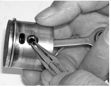 Piston removal and installation Snap rings, called circlips in the trade, anchor the wrist pin to the piston. Should a circlip fail, the pin can drift into the cylinder wall with disastrous consequences. Always use new circlips, positioned in the pin bores their open ends on the long cylinder axis. If the cylinder mounts vertically, with the open ends of the clips should be either up or down. Otherwise, the side forces generated at mid-stroke can loosen the clips. All modern engines support the wrist pin on needle bearings and many have spacers between the piston and rod end. Small-end bearings may be caged, as shown in Fig. 15, or loose. A magnet helps restrain loose needles. When all needles are accounted for, the bearing will be packed without room for another needle.
