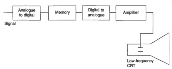 For example, a 20 MHz CRO will have a rise time of 0.35420 x 10^6) seconds, or 17.5 ns. This means that if the instrument is presented with a voltage waveform with rise times faster than this value, the rise time that will be displayed is the CRO rise time. In order for the effect of the properties of the CRO not to significantly intrude on the display, the fastest rise time that can be displayed should be not less than eight times the CRO rise time. From this relation, the required CRO bandwidth can be calculated in order to display a given signal rise time. For example, if the signal rise time is 80 ns, then the CRO rise time must be 10 ns in order not to change the display significantly. A 10 ns rise time corresponds to a CRO bandwidth of 0.35/10-' Hz, or 35 MHz. This procedure allows the necessary bandwidth to be calculated for a given rise time and checked against the instrument in use, and it can establish whether a new instrument is needed. Since fast rising voltages are commonly found in digital circuits, the need for high bandwidth CROs is clear. 2.9 The high bandwidth CRO A high bandwidth CRO is significantly more expensive than a general purpose CRO. There are several reasons for this. In the first place, as the spot moves over the surface very rapidly at high frequencies, the emitted light reduces. To compensate for this the electron beam velocity is increased, but this tends to reduce the sensitivity of the instrument and so extra care is required with the electronics. As the electron beam passes through the deflection plates the forces on the electrons change significantly at high frequencies. This again reduces the sensitivity. This is overcome by splitting the Y deflection plates into a number of small sections arid introducing time delays between each. This ensures that the signal on each plate remains closely the same as the electron beam passes down the tube. It makes the CRT much more expensive, however.