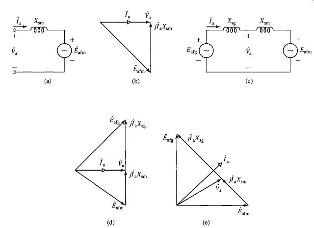 FIG. 30 shows a cutaway view of a typical permanent-magnet ac motor. This figure also shows a speed and position sensor mounted on the rotor shaft. This sensor is used for control of the motor, as is discussed in Section 11.2. A number of techniques may be used for shaft-position sensing, including Hall-effect devices, light-emitting diodes and phototransistors in combination with a pulsed wheel, and inductance pickups. Permanent-magnet ac motors are typically operated from variable-frequency motor drives. Under conditions of constant-frequency, sinusoidal polyphase excitation, a permanent-magnet ac motor behaves similarly to a conventional ac synchronous machine with constant field excitation. An alternate viewpoint of a permanent-magnet ac motor is that it is a form of permanent-magnet stepping motor with a nonsalient stator (see Section 8.5). Under this viewpoint, the only difference between the two is that there will be little, if any, saliency (cogging) torque in the permanent-magnet ac motor. In the simplest operation, the phases can be simply excited with stepped waveforms so as to cause the rotor to step sequentially from one equilibrium position to the next. Alternatively, using rotor-position feedback from a shaft-position sensor, the motor phase windings can be continuously excited in such a fashion as to control the torque and speed of the motor. As with the stepping motor, the frequency of the excitation determines the motor speed, and the angular position between the rotor magnetic axis and a given phase and the level of excitation in that phase determines the torque which will be produced. Permanent-magnet ac motors are frequently referred to as brushless motors or brushless dc motors. This terminology comes about both because of the similarity, when combined with a variable-frequency, variable-voltage drive system, of their speed-torque characteristics to those of dc motors and because of the fact that one can view these motors as inside-out dc motors, with their field winding on the rotor and with their armature electronically commutated by the shaft-position sensor and by switches connected to the armature windings. 9. SUMMARY Under steady-state operating conditions, the physical picture of the operation of a polyphase synchronous machine is simply seen in terms of the interaction of two magnetic fields as discussed in Section 4.7.2. Polyphase currents on the stator produce a rotating magnetic flux wave while dc currents on the rotor produce a flux wave which is stationary with respect to the rotor. Constant torque is produced only when the rotor rotates in synchronism with the stator flux wave. Under these conditions, there is a constant angular displacement between the rotor and stator flux waves and the result is a torque which is proportional to the sine of the displacement angle. We have seen that a simple set of tests can be used to determine the significant parameters of a synchronous machine including the synchronous reactance Xs or Xd. Two such tests are an open-circuit test, in which the machine terminal voltage is measured as a function of field current, and a short-circuit test, in which the armature is short-circuited and the short-circuit armature current is measured as a function of field current. These test methods are a variation of a testing technique applicable not only to synchronous machines but also to any electrical system whose behavior can be approximated by a linear equivalent circuit to which Thevenin's theorem applies. From a Thevenin-theorem viewpoint, an open-circuit test gives the intemal voltage, and a short-circuit test gives information regarding the internal impedance. From the more specific viewpoint of electromechanical machinery, an open-circuit test gives information regarding excitation requirements, core losses, and (for rotating machines) friction and windage losses; a short-circuit test gives information regarding the magnetic reactions of the load current, leakage impedances, and losses associated with the load current such as I^2R and stray load losses. The only real complication arises from the effects of magnetic nonlinearity, effects which can be taken into account approximately by considering the machine to be equivalent to an unsaturated one whose magnetization curve is the straight line Op of FIG. 9 and whose synchronous reactance is empirically adjusted for saturation as in Eq. 29. In many cases, synchronous machines are operated in conjunction with an external system which can be represented as a constant-frequency, constant-voltage source known as an infinite bus. Under these conditions, the synchronous speed is determined by the frequency of the infinite bus, and the machine output power is proportional to the product of the bus voltage, the machine internal voltage (which is, in turn, proportional to the field excitation), and the sine of the phase angle between them (the power angle), and it is inversely proportional to the net reactance between them. While the real power at the machine terminals is determined by the shaft power input to the machine (if it is acting as a generator) or the shaft load (if it is a motor), varying the field excitation varies the reactive power. For low values of field current, the machine will absorb reactive power from the system and the power angle will be large. Increasing the field current will reduce the reactive power absorbed by the machine as well as the power angle. At some value of field current, the machine power factor will be unity and any further increase in field current will cause the machine to supply reactive power to the system. Once brought up to synchronous speed, synchronous motors can be operated quite efficiently when connected to a constant-frequency source. However, as we have seen, a synchronous motor develops torque only at synchronous speed and hence has no starting torque. To make a synchronous motor self-starting, a squirrel-cage winding, called an amort