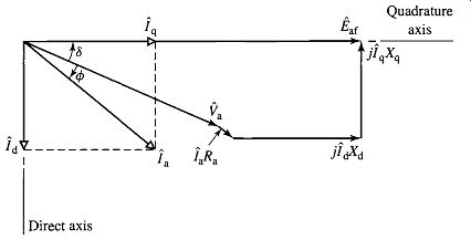 Focusing our attention on the space-fundamental components of the air-gap flux and mmf, the effects of salient poles can be taken into account by resolving the armature current [a into two components, one along the direct axis and the other along the quadrature axis as shown in the phasor diagram of FIG. 22. This diagram is drawn for a unsaturated salient-pole generator operating at a lagging power factor. The direct-axis component id of the armature current, in time-quadrature with the generated voltage J~af, produces a component of the space-fundamental armature-reaction flux t~)ad along the axis of the field poles (the direct axis), as in FIG. 20. The quadrature-axis component iq, in phase with the generated voltage, produces a component of the space-fundamental armature-reaction flux t~aq in space-quadrature with the field poles, as in FIG. 21. Note that the subscripts d ("direct") and q ("quadrature") on the armature-reaction fluxes refer to their space phase and not to the time phase of the component currents producing them. Thus a direct-axis quantity is one whose magnetic effect is aligned with the axes of the field poles; direct-axis mmf's produce flux along these axes. A quadrature-axis quantity is one whose magnetic effect is centered on the interpolar space. For an unsaturated machine, the armature-reaction flux t~ar is the sum of the components t~ad and t~)aq. The resultant flux t~ R is the sum of ~ar and the field flux t~f. 6.2 Phasor Diagrams for Salient-Pole Machines