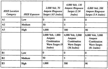 3.1.1.7 IEEE C62.41-1991: "IEEE Recommended Practice on Surge Voltages in Low Voltage AC Power Circuits" IEEE C62.41 identifies location categories within a building, described as A 1, A2, A3, B l, B2, and B3 for surge locations. The "A" and "B" location prefixes represent wiring run distances within a building, the "l," "2," and "3," suffixes represent surge severity. "A" category locations receive their power after more than 60 feet of wiring run from the main power service entrance, with frequent exposure to comparatively low energy surges. These low energy surges are created when internal equipment cycles on and off, collapsing the magnetic field around the lengthy building wiring carrying the current. The collapsing magnetic field induces surge voltage in the wires proportional to the current being carded by the wiring and the length of wiring. External surges will be of a lesser threat in "A" locations than "B" locations due to the impedance protection provided by the inductance of the building wiring in "A" locations. IEEE specifies a low energy "ringwave" surge waveform for the "A" locations. "B" category locations are within a building, close to the power service entrance, with greater exposure to infrequent, high energy surges originating outside the building. The "B" location category surges can be caused by lightning, power outages due to storms, and normal utility switching functions. A "combination wave" with high surge energy is specified by IEEE for these "B" locations. "1," "2," and "3" denote low, medium, and high exposures respectively, in terms of the number and severity of surges, with "1" being the least severe and "3" being the most severe. A "B3" location, therefore, would have the highest exposure to surge energy, while a "A 1" location would have the lowest incidence of surge energy.