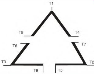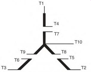 Each pole has the same voltage across it, whether the motor is connected high or low voltage. A telephone keypad (Fig. 5.17) simplifies three-phase connections. Exactly one-half of each phase is connected between two keys. For example the A phase, one half of its winding is connected between keys T1 and T4, and the other half between key T7 and the blank key below it. The keypad can be used as a reference for wye, delta, 12-lead, 10-lead, and wye-delta connections. The keys have windings connected to them as shown in Fig. 5.17. A wye-connected motor will have the bottom three keys tied together (internally) to form the wye connection. For the 10-lead connection, lead number T10 is connected to the internal wye.