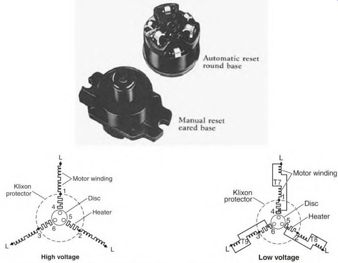 Automatic rcsL-r round bas-c Manual reset cared base This protection is designed for small wye-connected motors. (The delta connection is seldom used in motors under 5 horsepower.) In Fig. 5.23, there are three current-monitoring heat elements. High current through these heat elements will trip open the protector's contacts. They are located between 1 and 4, 2 and 5, and 3 and 6. The motor's internal wye is connected permanently to terminals 1, 2, and 3 of the thermal protector. These leads are the ends of the phases. (In a 12-lead motor, they are labeled T10, T11, and T12.) P4, P5, and P6 bypass the heat elements. When the motor is connected low voltage, they are connected to the motor's corresponding T leads (P4 to T4, P5 to T5, and P6 to T6). If connected high voltage, P4, P5, and P6 aren't used and are separately insulated. If line 1, 2, or 3 becomes open, the motor operates on single phase. (The term single-phased describes this condition.) When a motor is single-phased, its power drops to approximately one-half of its horsepower rating. The amperes increase through two of the heat elements, causing the protector's contacts to open and disconnect all the motor's circuits. The thermal protector uses the amperes of T7, T8, and T9 to protect the motor, whether the connection is high or low voltage. Nine-Lead Delta Connection In the delta connection, T1, T2, and T3 are the points of the delta (Fig. 5.24). They contain the end half of one phase and the start half of the next phase. In the start half of phase A, lead T1 is connected to (the end) half of phase B. One-half of phase A starts at T1 and ends at T4. Lead T7 completes phase A, …