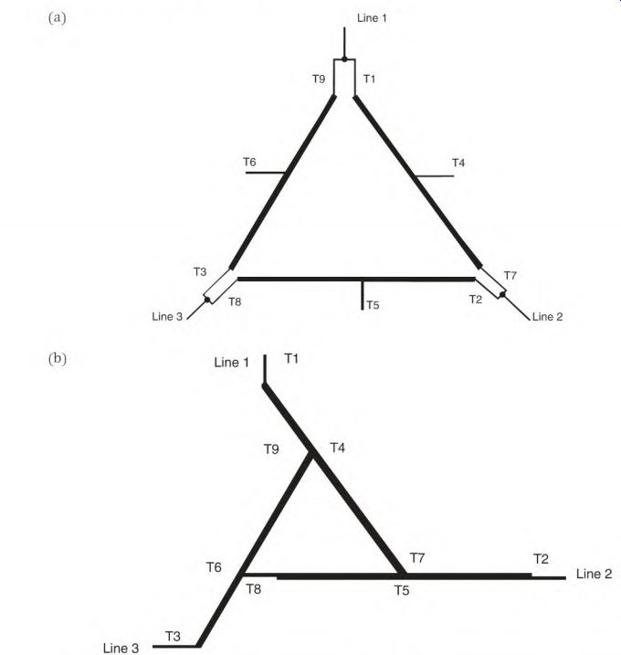 Both wye- and delta-connected motors combine the same lead numbers for high voltage. In both connections, each phase is connected in series for high voltage. In the wye connection (Fig. 5.20), a circuit from line 1 to line 2 goes through two phases. Nine-Lead Multiple-Wye Connection with T10 The internal wye sometimes has lead T10 connected to it. This lead is connected to T4, T5, and T6 when the motor is connected low voltage (Fig. 5.21). When the motor is connected high voltage, T10 is insulated and not used. The purpose of T10 is to balance the voltage (and the resulting current) between the wye connections. Ideally, wye connections would have no voltage or current difference between them. (In reality, there is always some unbalance.) The most common reason for the unbalance is a slight difference in air gap around the rotor. Connecting T10 as shown in Fig. 5.22 ...