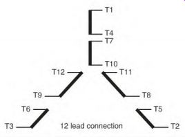 ... ending at T2. Phase C starts at T2 and ends at T5. Lead T8 completes phase C, ending at T3. Phase B starts at T3 and ends at T6. Lead T9 completes phase B, ending at T1. When the delta is connected low voltage, each line is connected to three motor leads. Line 1 is connected to T1, T6, and T7; line 2 to T2, T4, and T8; and line 3 to T3, T5, and T9. Figure 5.25 shows how the circuits of each phase are connected in parallel. Multiple-Delta Connection The delta connection is found on motors above 5 horsepower. Larger nine- lead motors may have multiple deltas, connected internally. The external lead numbers are the same, and they are connected as described in Fig. 5.26. Both delta- and wye-connected motors combine the same lead numbers for high voltage. Each phase is connected series in both connections. As shown in Fig. 5.27, each phase is connected across the line. Twelve-Lead Connection The 12-lead connection gives a motor greater versatility. A motor with this connection can be used on four different voltages. In Fig. 5.28, the end of each phase is accessible by leads T10, T11, and T12. The rest of the leads (1 through 9) use the same lead number combinations as the nine-lead connection. Figures 5.29 through 5.32 show four different voltage connections that can be used on the 12-lead motor.