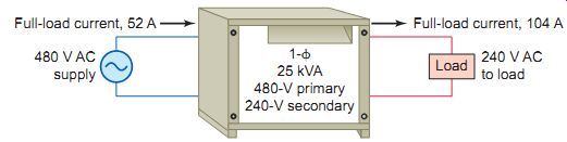 The voltage ratio of an ideal transformer (one with no losses) is directly related to the turns ratio, while the cur rent ratio is inversely related to the turns ratio: Turns primary/Turns secondary = Voltage primary/Voltage secondary = Current secondary/Current primary The following table shows examples of some common single-phase transformer turns ratios based on primary and secondary voltage ratings. Primary voltage | Secondary voltage | Turns ratio 480 V 240 V 2:1 480 V 120 V 4:1 480 V 24 V 20:1 600 V 120 V 5:1 600 V 208 V 2.88:1 208 V 120 V 1.73:1 Ill. 20 shows the schematic diagram of a step-up transformer wound with 900 turns on the primary winding and 1800 turns on the secondary winding. As a step-up unit, this transformer converts low-voltage, high-current power into high-voltage, low-current power. The transformer equations that apply to this circuit are as follows: Turns ratio = Number of turns on the primary/Number of turns on the secondary = 900 /1800 = 1 /2 = 1: 2 turns ratio If the voltage of one winding and the turns ratio are known, the voltage of the other winding can be determined. Primary voltage = Secondary voltage × Turns ratio Secondary voltage = Primary voltage/Turns ratio If the current of one winding and the turns ratio are known, the current of the other winding can be determined. Primary current = Secondary current/Turns ratio Secondary current = Primary current × Turns ratio Ill. 21 shows the schematic diagram of a step-down transformer wound with 1,000 turns on the primary winding and 50 turns on the secondary winding. As a step-down unit, this transformer converts high-voltage, low-current power into low-voltage, high-current power. A larger-diameter wire is used in the secondary winding to handle the increase in current. The primary winding, which doesn't have to conduct as much current, may be made of a smaller diameter wire. The transformer equations that apply to this circuit are the same as those for a step-up transformer: Turns ratio = Number of turns on the primary / Number of turns on the secondary If the voltage of one winding and the turns ratio are known, the voltage of the other winding can be determined. Primary voltage = Secondary voltage × Turns ratio Secondary voltage = Primary voltage/ Turns ratio If the current of one winding and the turns ratio are known, the current of the other winding can be determined.