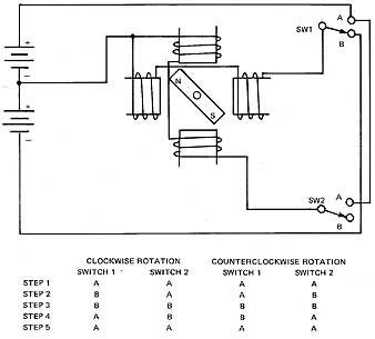 STEPPING MOTORS Another type of motor that can use a permanent magnet on the rotor is called a step ping motor, Instead of having a continuous supply of power and a continuous rotation, the rotor moves in steps as the stator is energized. The advantage of this type of motor is that motion can be monitored and exact degrees of rotation can be obtained from the input to the motor. These motors don't produce a great deal of torque so they are often used in small equipment needing incremental motion or “motion in steps.” The concept of the motor is to energize the stator field and allow the rotor poles to move into a desired position that provides magnetic alignment. Instead of providing a rotating magnetic field or a dc field with commutation, the fields are more stationary. As seen in 13, the stator can be energized by moving switches 1 and 2 to either position A or B. The first switch sequence illustrated in 13 will result in clockwise rotation; the second sequence produces counterclockwise rotation.