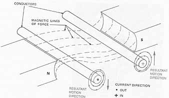 AMAZON multi-meters discounts AMAZON oscilloscope discounts OBJECTIVES • list the parts of a dc shunt motor. • draw the connection diagrams for series shunt and compound motors. • define torque and tell what factors affect the torque of a dc shunt motor. • describe counter emf and its effects on current input. • describe the effects of an increased load on armature current, torque, and speed of a dc shunt motor. • list the speed control, torque, and speed regulation characteristics of a dc shunt motor. • make dc motor connections. The production of electrical energy, and its conversion to mechanical energy in electric motors of all types, is the basis of our industrial structure. DC motor principles are found elsewhere on this site. CONSTRUCTION FEATURES DC motors closely resemble dc generators in construction features. In fact, it's difficult to identify them by appearance only. A motor has the same two main parts as a generator -- the field structure and the armature assembly consisting of the armature core, armature winding, commutator, and brushes. Some general features of a dc motor are illustrated in 1A and B. The Field Structure The field structure of a motor has at least two pairs of field poles, although motors with four pairs of field poles are also used ( 2A). A strong magnetic field is pro vided by the field windings of the individual field poles. The magnetic polarity of the field system is arranged so that the polarity of any particular field pole is opposite to that of the poles adjacent to it. The Armature The armature of a motor is a cylindrical iron structure mounted directly on the motor shaft ( l-2B). In DC motors, the armature is the rotating component of the motor. Armature windings are embedded in slots in the surface of the armature and terminate in segments of the commutator. Current is fed to these windings on the rotating armature by carbon brushes which press against the commutator segments. This current in the armature sets up a magnetic field in the armature which acts with the magnetic field of the field poles. These magnetic effects are used to develop torque which causes the armature to turn ( 3). The commutator changes the direction of the current in the armature conductors as they pass across poles of opposite magnetic polarity. Continuous rotation in one direction results from these reversals in the armature current. ill 4 is a cutaway view of a dc motor available with horsepower ratings ranging from 25.0 hp to 1,000 hp.