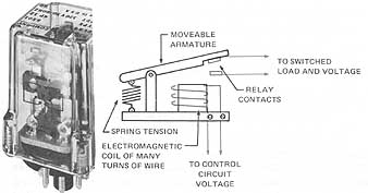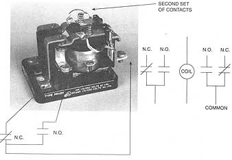 The coil voltages of the relay are separate or different from those at the switched contacts; this is called separate control. However, the coil voltage may be the same sys tem voltage as the switched voltage. Relays are available in many shapes and sizes. Some are sealed in dustproof, transparent plastic enclosures (ill. 3 A). The general construction of a typical relay is illustrated in 3B. Note in ill. 2 that relay contacts maybe normally-closed or normally-open. The action of the contacts is to switch something on or off depending on the configuration.