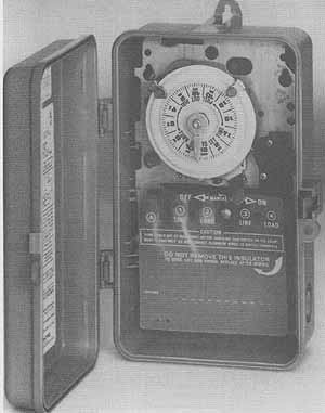 Solid state relays have a wide range of input or control voltage designs. The solid state relays may operate at TTL (transistor logic levels) + 5 volts dc. They may operate at levels between 3—30V dc or other relays at 90—120V ac. Considerations as to what style of relay include the way that the SSR turn on. A zero switch relay turns on as the load volt age crosses zero. This is often used for resistive type loads. Instant-on relays turn on anytime during the ac waveform to the load. A third style is the universal switch. This turn-on occurs after the load voltage has reached peak and is moving toward zero. The universal switch is used for combination loads of inductive and resistive loads. TIMERS Timers come in many different styles and with different operating characteristics. The mechanical timers use either clock motors to operate a mechanical trip mechanism or solenoids to create timing operations. Pneumatic timers use air, a diaphragm, and an operating solenoid to cause a time delay. ill 8 shows a mechanical time-clock-type timer. This type of timer is used for rough time-of-day timing to turn lights or equipment on or off at an approximate time of day. Tabs on the face of the clock are moved to create different on and off periods.